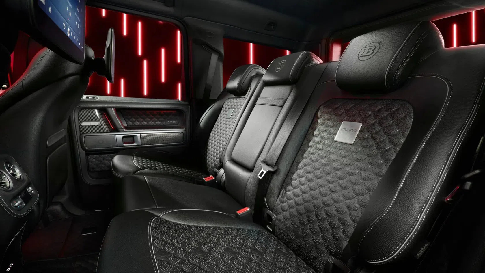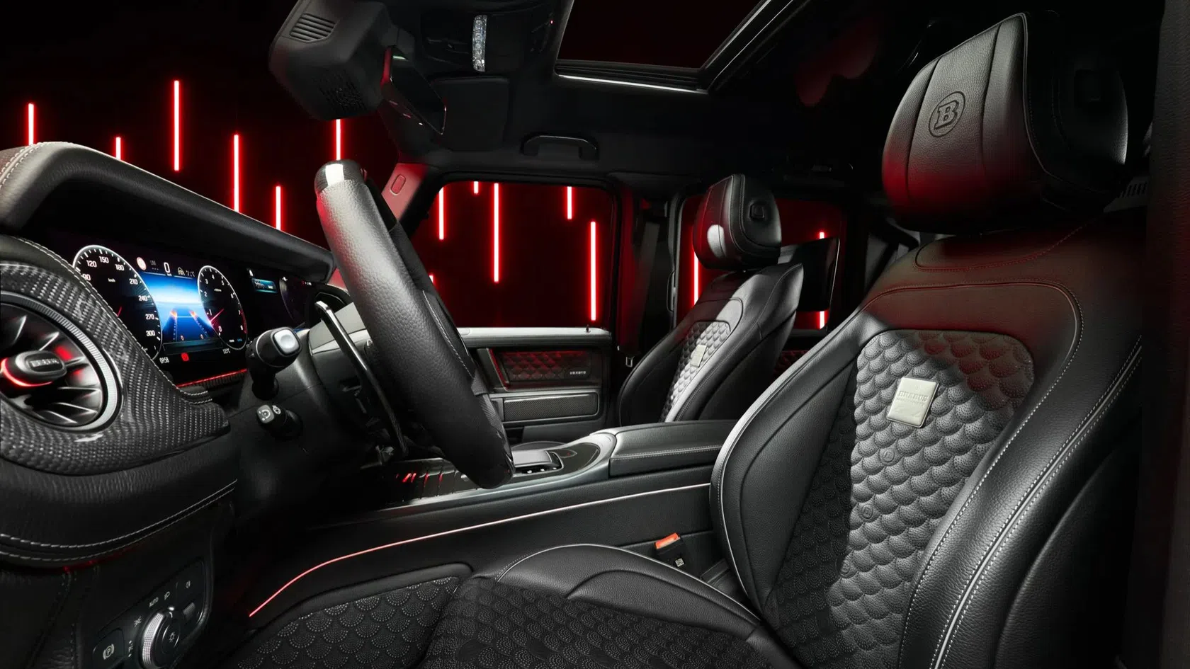 O habitáculo é totalmente personalizado segundo o programa BRABUS Masterpiece, com acabamento manual e padrões de costura exclusivos, como o o padrão de conchas, aplicado nos bancos, painéis das portas e piso.