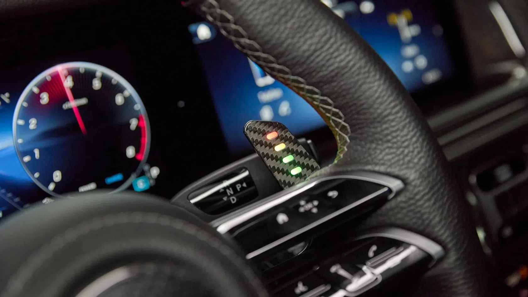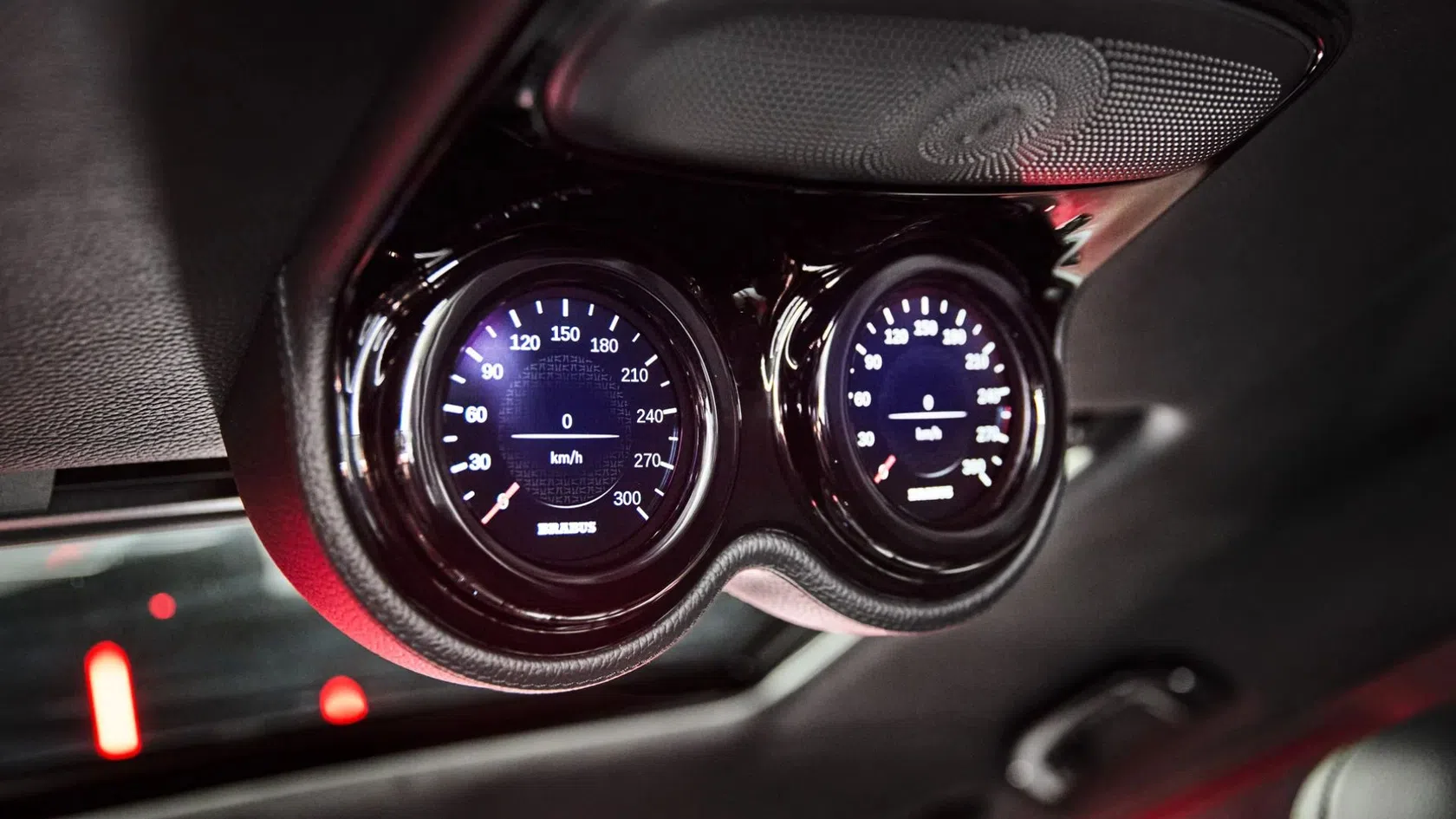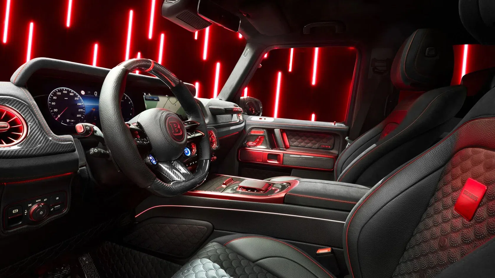 O uso de fibra de carbono exposta estende-se ao tablier, consola central e pedais, enquanto painéis iluminados com branding BRABUS surgem nas portas e na bagageira. Um detalhe tecnológico relevante é o sistema de LEDs integrados que indica a progressão do regime do motor, auxiliando o condutor a identificar o momento ideal de troca de caixa.