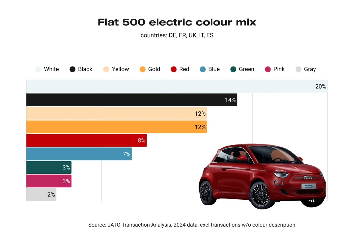 Apesar do domínio das cores neutras, alguns modelos conseguem contrariar a tendência. Carros de forte apelo emocional, como o Fiat 500 e o Renault 5, registam taxas muito superiores de escolha em tons vibrantes, incluindo amarelo, vermelho, azul e dourado.