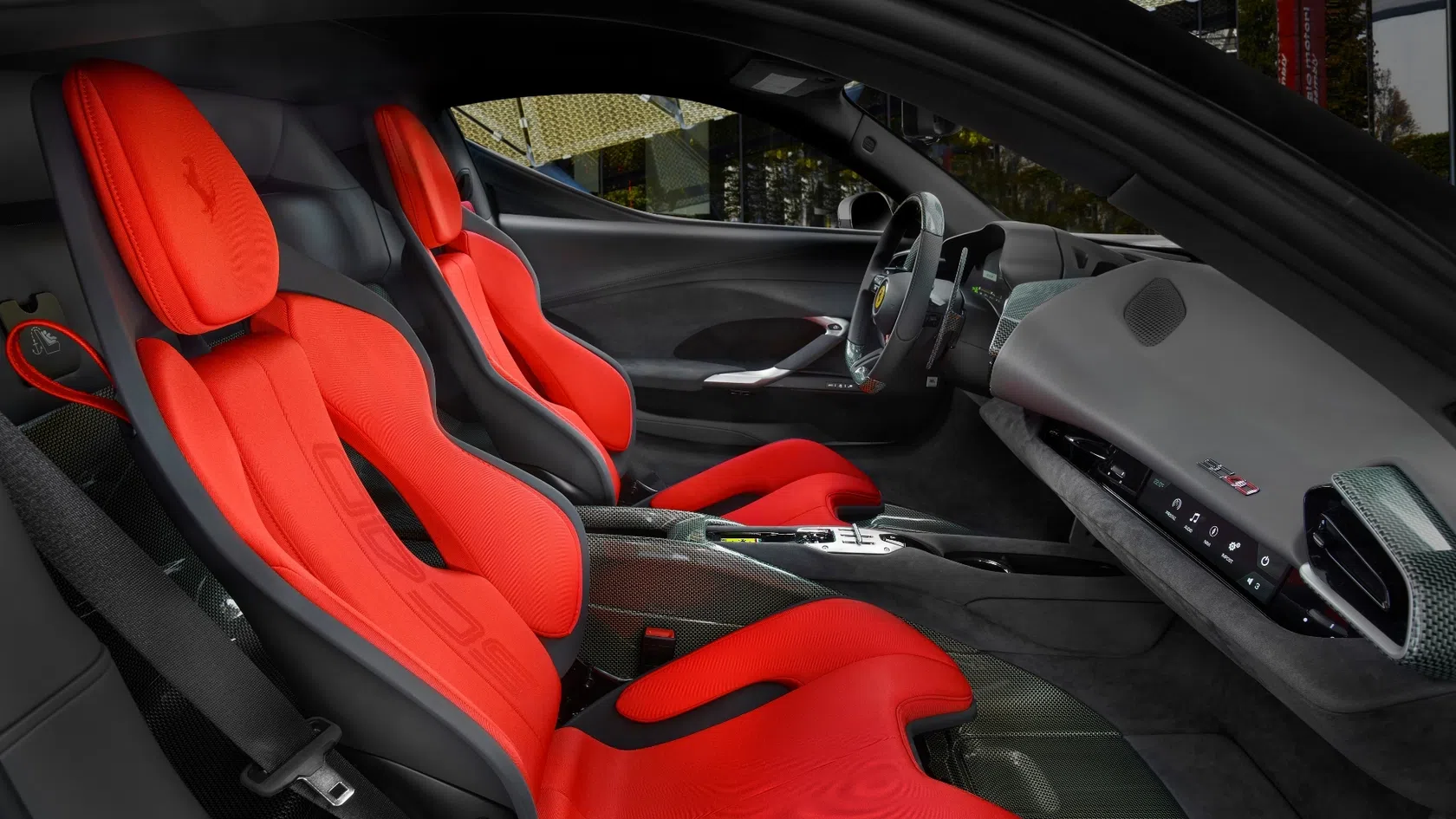 Os bancos são revestidos em Alcântara cinza com tecido técnico vermelho Jacquard, incorporando o cavalo rampante bordado nos encostos de cabeça e o logótipo SC40 tecido nas superfícies.