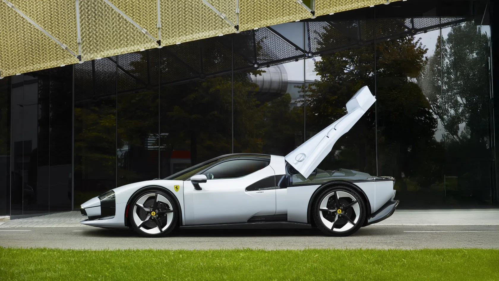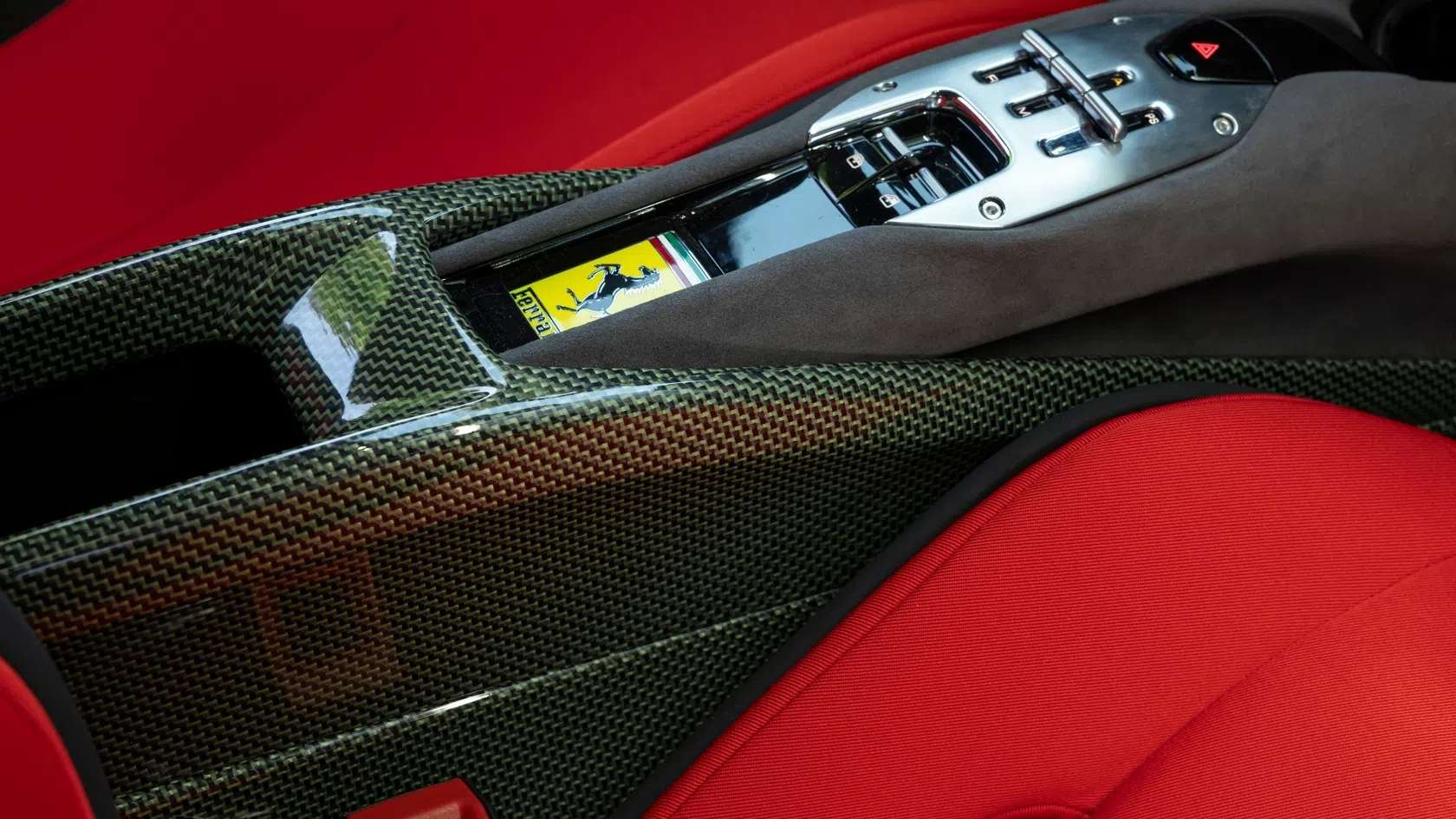 - Inscrição Ferrari recortada na tampa do motor, revelando o carbono subjacente.