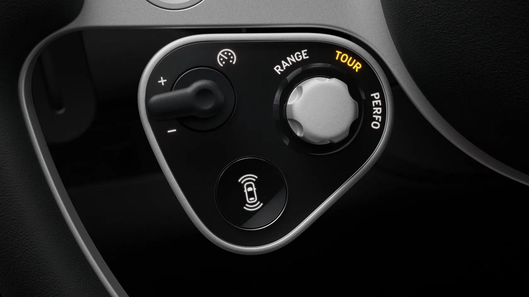 O volante adota um design simplificado de três raios, reinterpretando o clássico volante Nardi dos anos 50 e 60. É fabricado em alumínio 100% reciclado, com 19 peças maquinadas por CNC (Controlo Numérico Computorizado, tecnologia de precisão industrial).