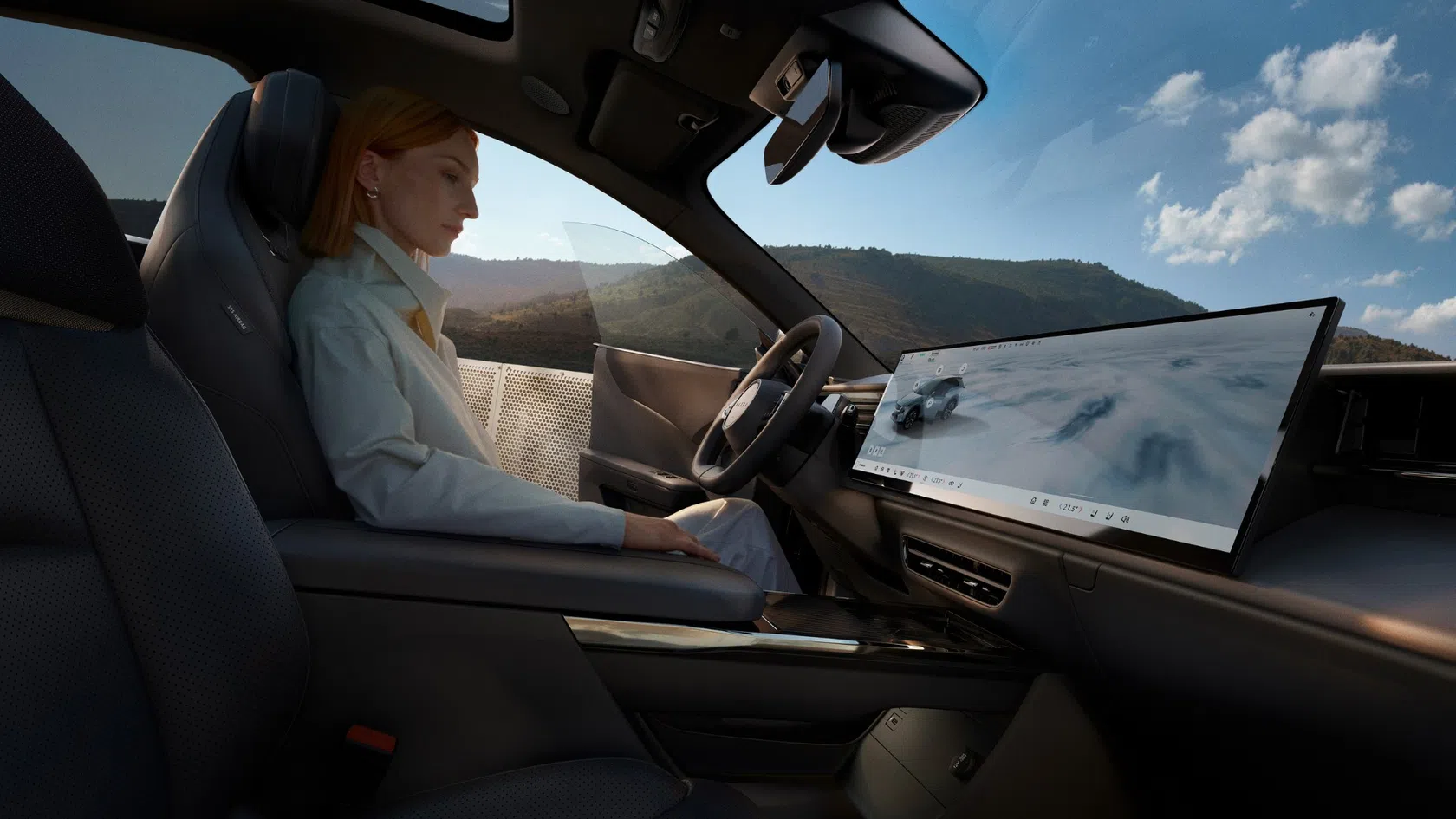 O destaque tecnológico é o ecrã tátil panorâmico de 26 polegadas, que centraliza as principais funções do veículo. O sistema suporta Apple CarPlay e Android Auto sem fios, reconhecimento de voz e controlo por gestos. O termo “head-up display” refere-se a um sistema que projeta informações essenciais no campo de visão do condutor, reduzindo a necessidade de desviar o olhar da estrada.