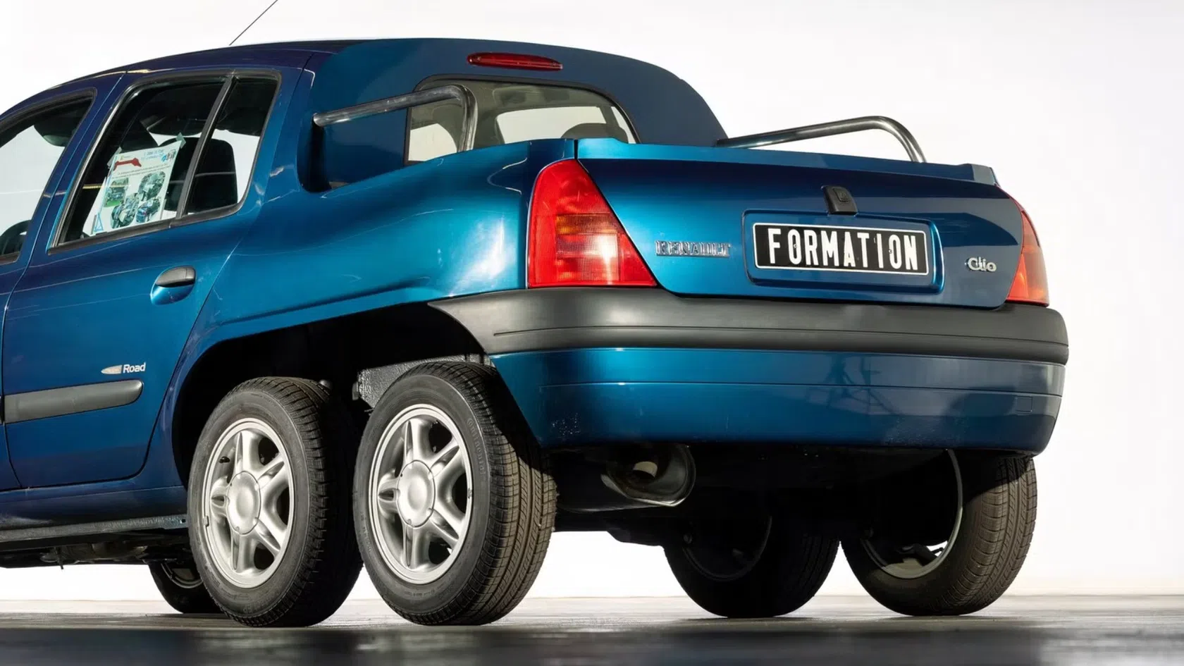 No centro das atenções de um leilão de raridades está um inusitado Renault Clio de segunda geração transformado numa pickup com um total de seis rodas.