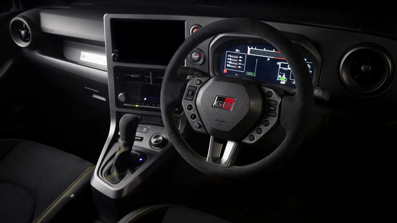 No habitáculo, o GR Yaris Morizo RR mantém a abordagem funcional, mas com elementos exclusivos. O volante em camurça, de diâmetro ligeiramente reduzido, foi desenvolvido para melhorar o controlo em condução desportiva. Os comandos no volante e as patilhas da transmissão foram redesenhados com base na experiência do GR Yaris Rally2.